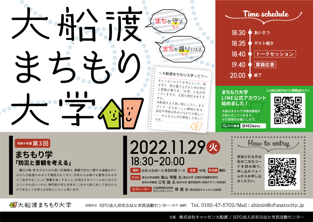 震災以降、町を守るための高い防潮堤は、景観や防災に関する議論を行いながら大船渡のみならず建設されてきた。市民からは様々な意見がある中で、「命を守ること」と「景観を良くすること」を両立させていくためにはどのようにすればいいのか。専門家の考えを学び、これから町に対して自分たちができることを考える材料としたいと思います。